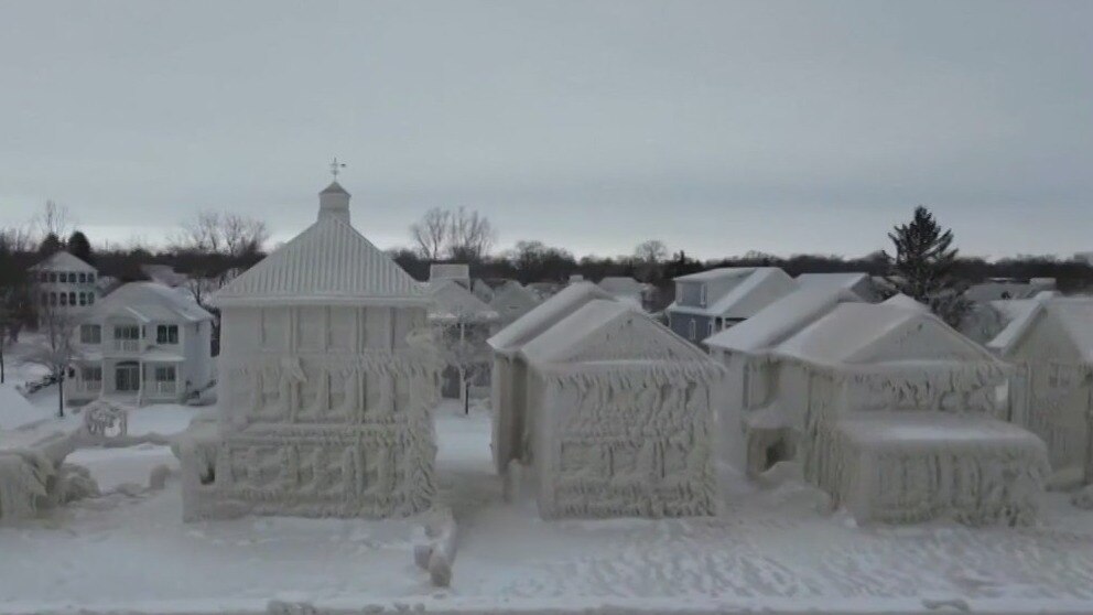 A lakefront community in Fort Erie, Ontario was covered in ice after a major winter storm threw water on homes before freezing into ice.