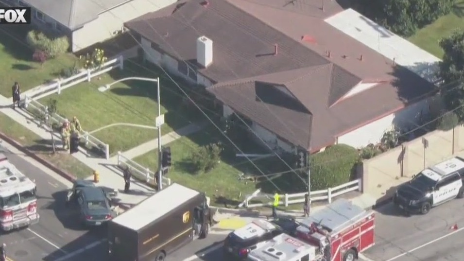 A UPS truck runs into a home in Huntington Beach.
