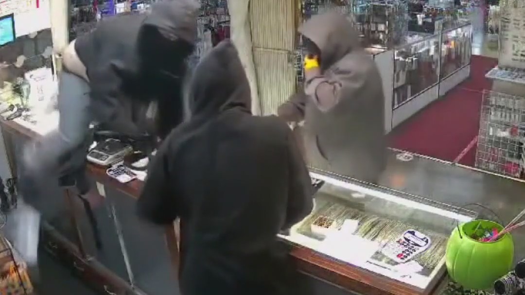 A robbery at the Valley Indoor Swap Meet in Panorama City was caught on surveillance footage, showing masked suspects smashing jewelry counters and stealing merchandise. One person was shot at the scene.
