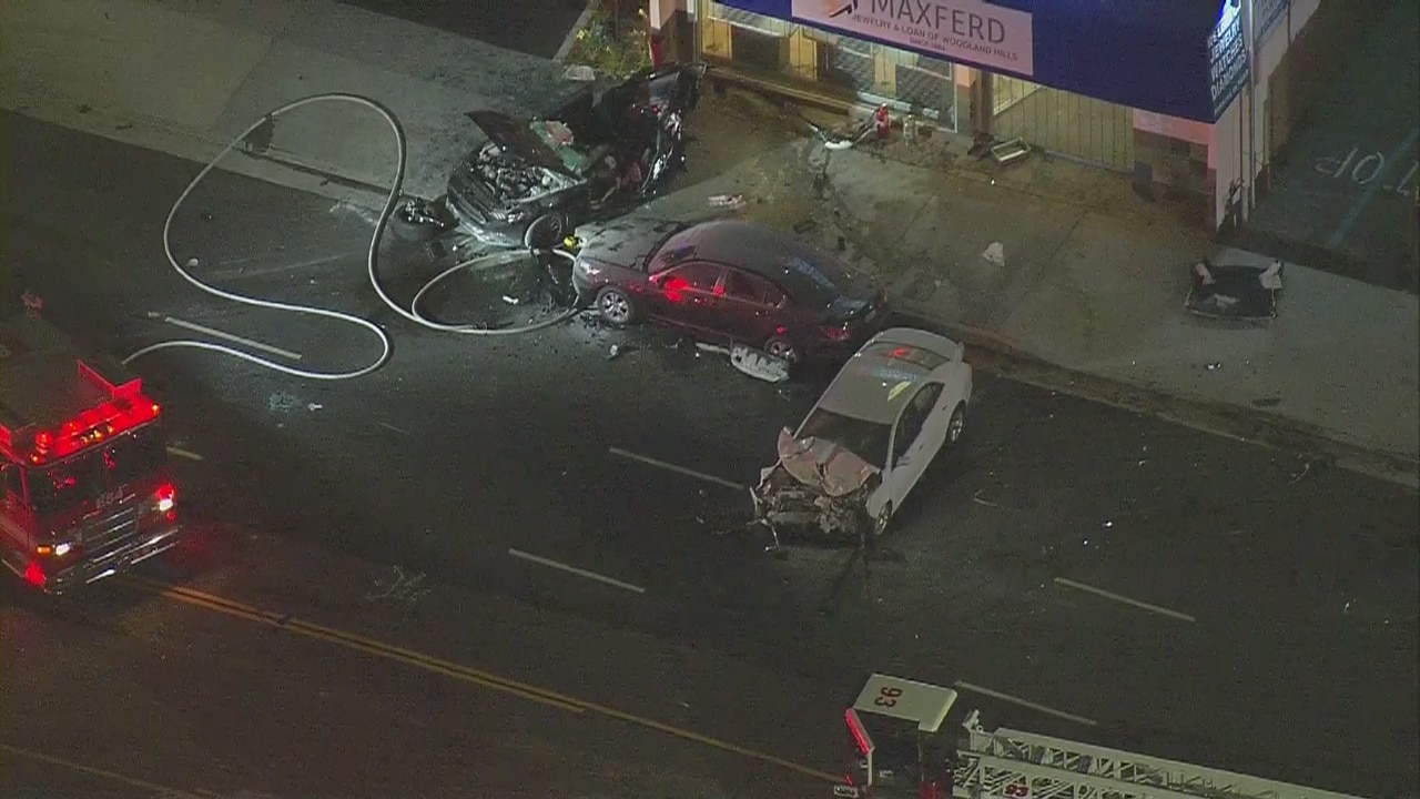 3 kills, 5 injured in fiery Woodland Hills crash
