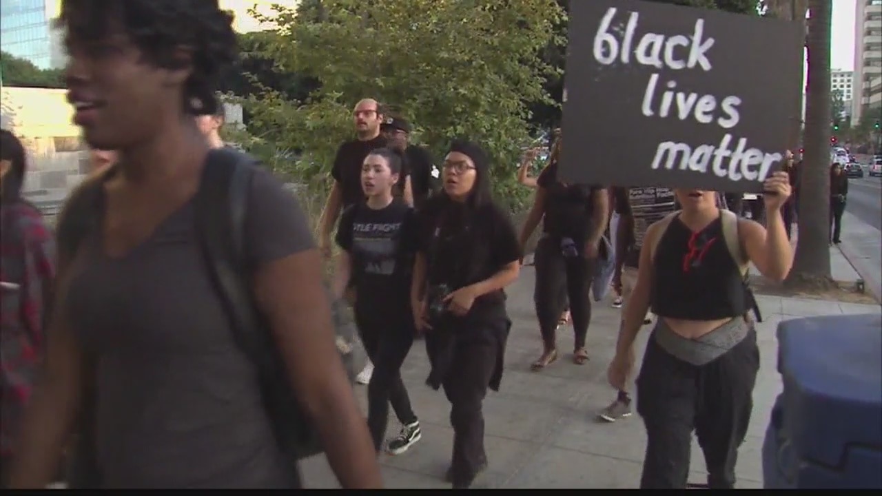 In DTLA at LA City Hall demonstrators gathered this evening to protest recent police shootings.