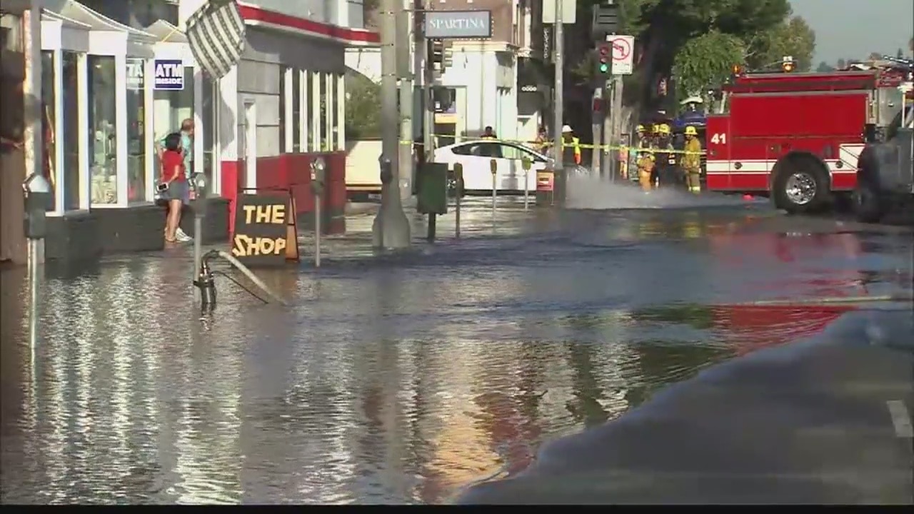 A major clean-up effort tonight in the Fairfax District after a water main break on Melrose flooded the street and several businesses.