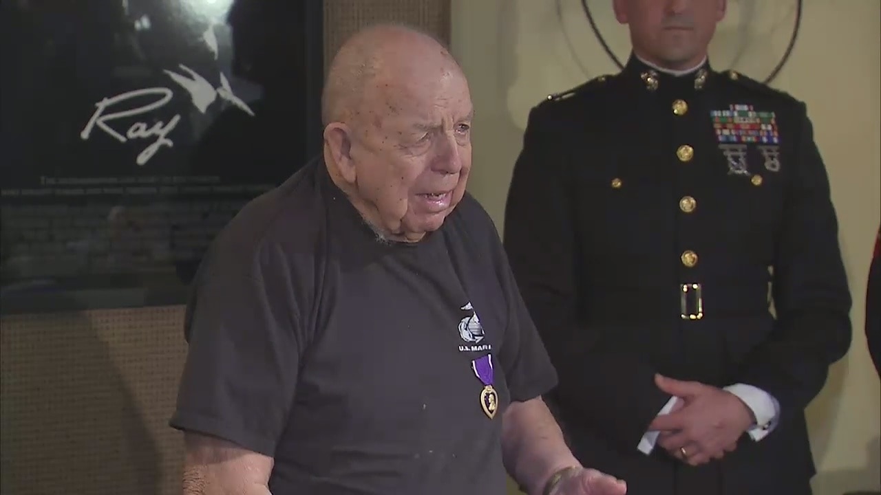 The U.S. Marine Corps presented the Purple Heart to a 91-year-old veteran who was wounded in combat during the battle of Iwo Jima. The award presentation was a surprise to the veteran during his morning coffee at a coffee shop in Canoga Park.