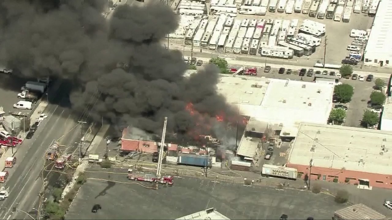 A greater-alarm fire tore through a door and hardware manufacturing business in Sun Valley today, but no one was injured.