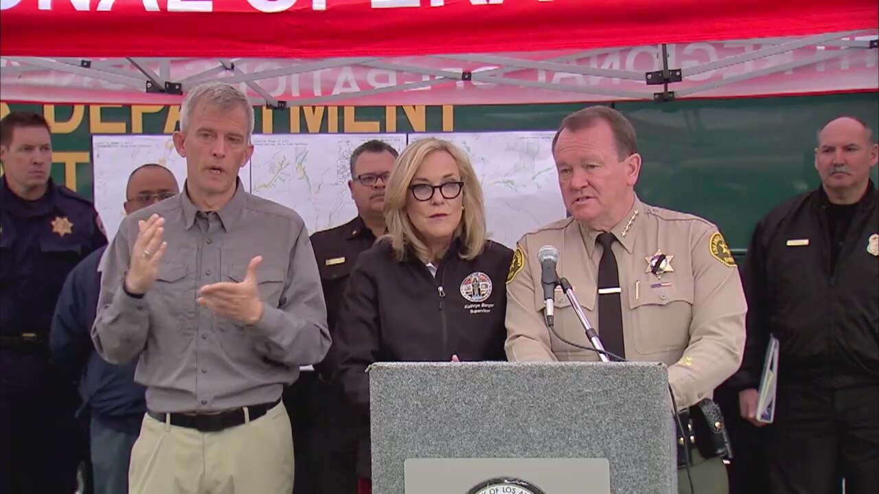 Officials hold news conference warning of mandatory evacuations for the Creek Fire and La Tuna Canyon Fire burn areas that will be in effect starting at 6 PM on Wednesday. Stephanie Stanton reports.