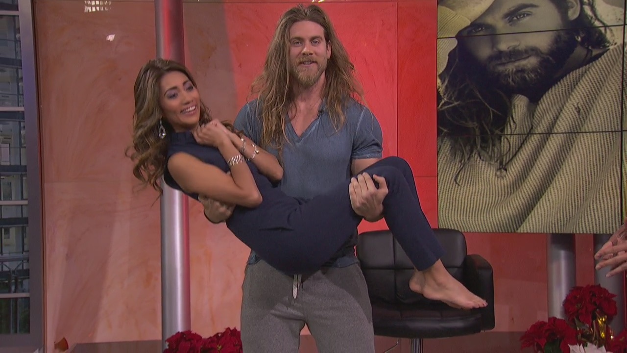 Brock O'Hurn does some human bicep curls with Rita Garcia as weight