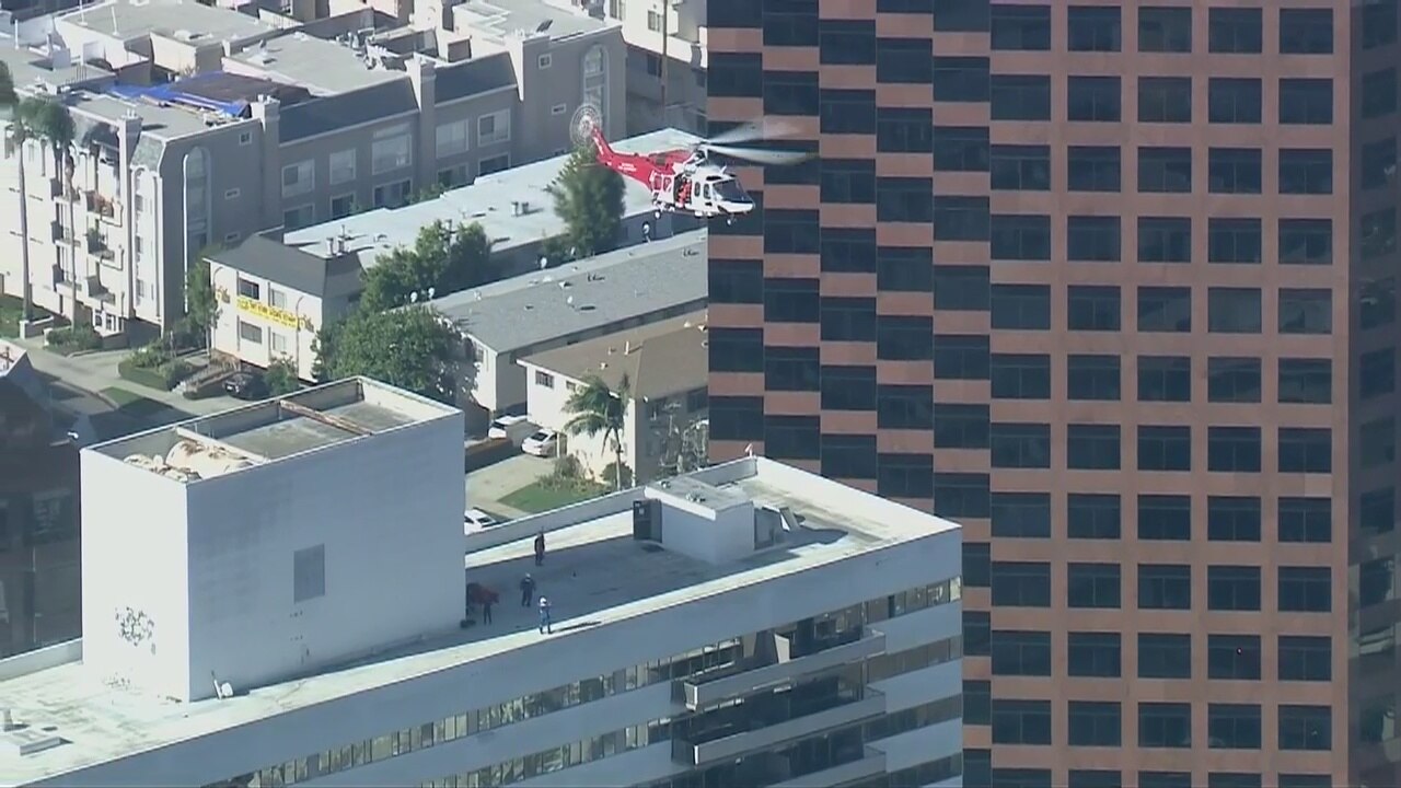 Firefighters worked to knock down and rescue evacuees from a high-rise apartment building in the Sawtelle neighborhood of West Los Angeles.