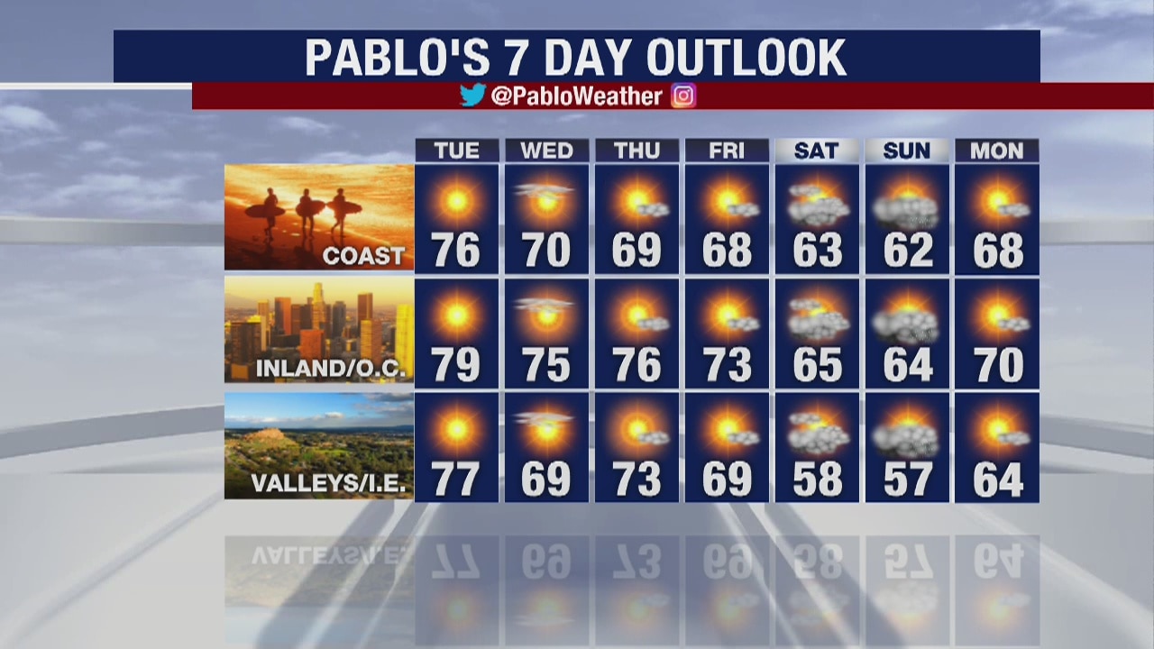 The latest forecast for the greater Los Angeles area, including beaches, valleys and desert regions.