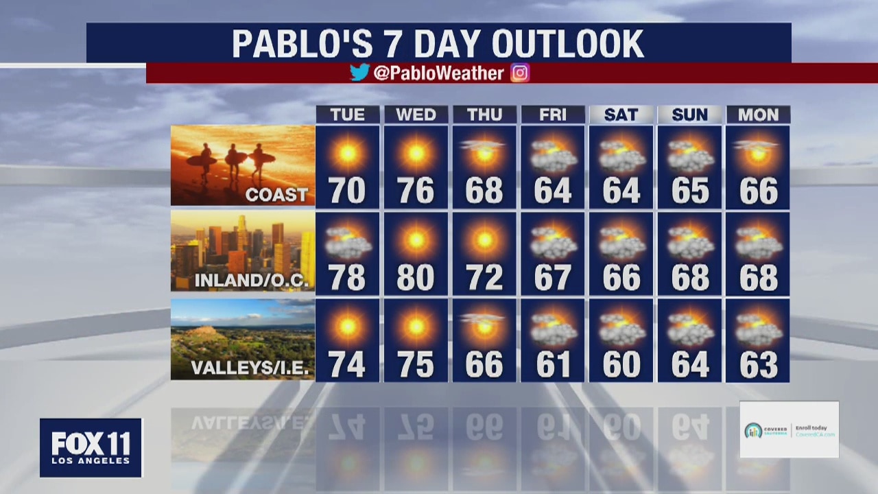 The latest forecast for the greater Los Angeles area, including beaches, valleys and desert regions.