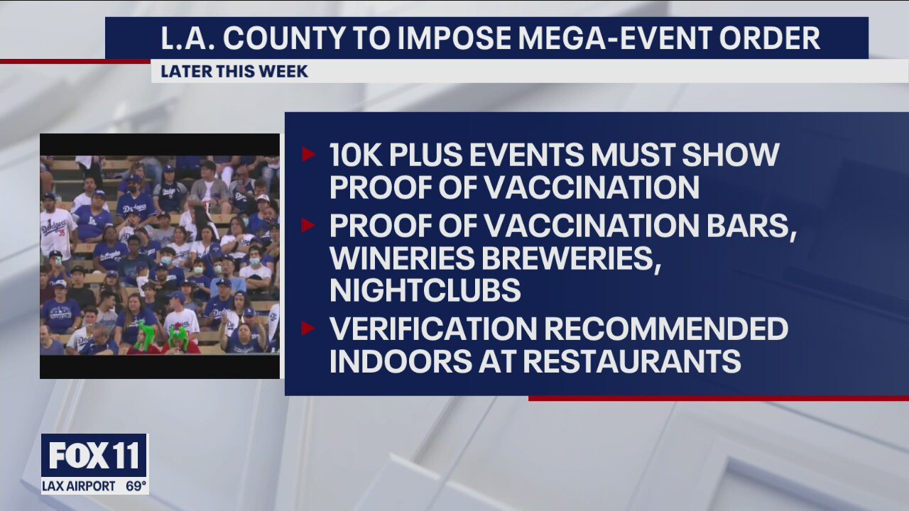 Los Angeles County is planning on issuing a new health officer order later this week that will require proof of vaccination for indoor bars, wineries, breweries, nightclubs and lounges. The order will also require proof of vaccination or a negative COVID test for outdoor mega-events, including Dodgers, Rams and Chargers games.