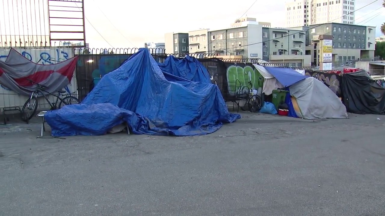 Downtown LA post office surrounded by trash, homeless encampments