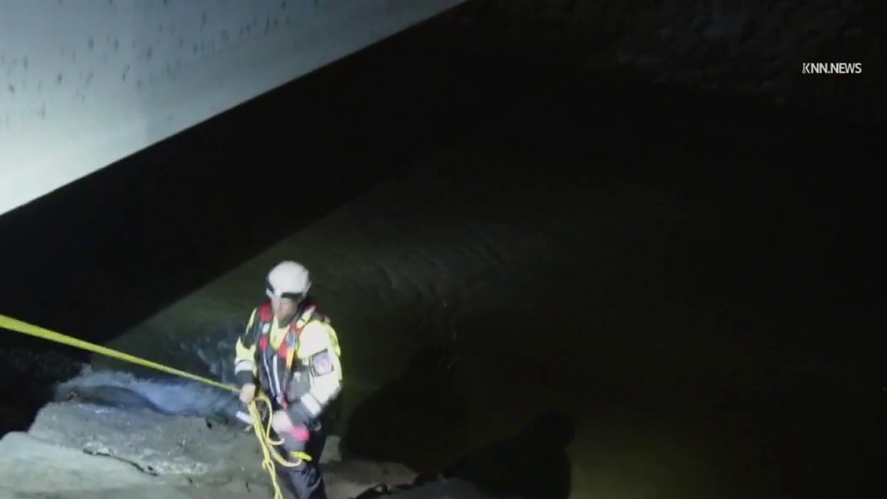 Firefighters jumped into action to help rescue a man from floodwaters in the LA River in Arleta.