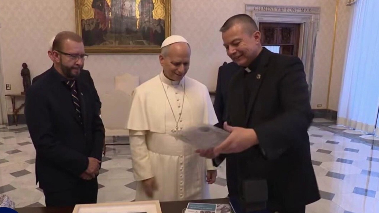 Children who attend St. Thomas the Apostle Catholic Church held a sign that said 'Pope Leo we love you — pray for us'. Their priest Father Mario Torres received an invitation to visit the Holy father and took letters from the kids, which he shared with the pontiff.