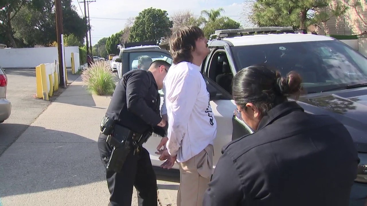 Exclusive video shows a suspect being arrested for allegedly stabbing a 10-year-old girl and her grandpa as they went to school Friday morning in Sunland.