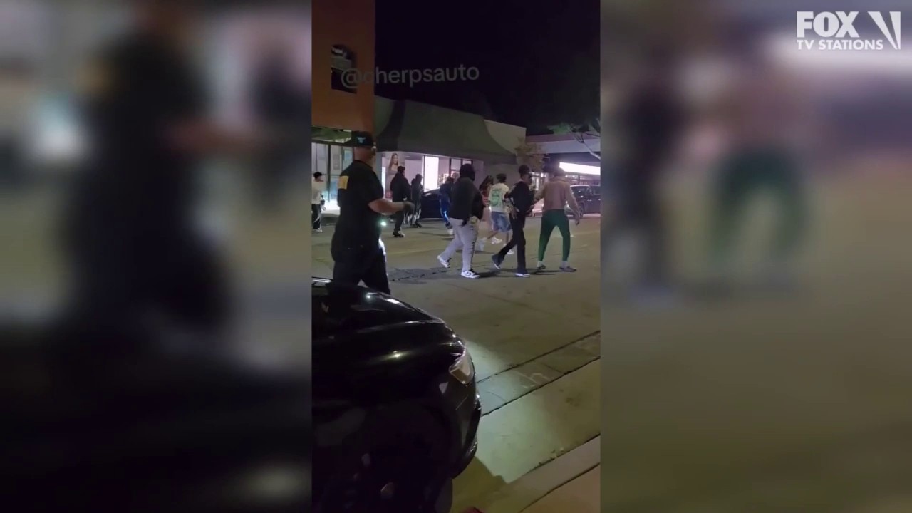 Video shows a car crashing into a group of people outside a bar in San Bernardino County.